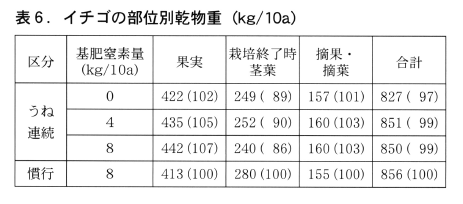 果実の乾物量及び養分吸収量はうね連続栽培区が慣行区を上回る結果となりました。うね連続栽培の基肥窒素量の違いによる比較では窒素が多いほど窒素,リン酸,カリウムの吸収量は多くなり,特にリン酸吸収量が高まる結果が得られました。
