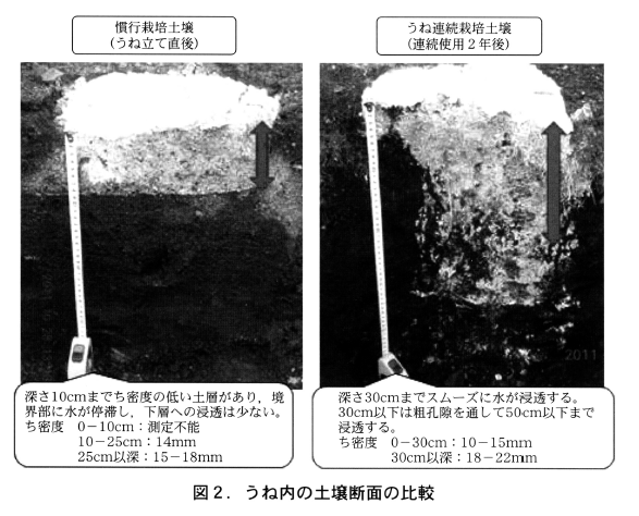 この2つの結果からうね連続栽培では土壌の排水性と通気性が大幅に高まり,それにより根の活性が高められ苗の活着を促進し,生育を前進化し,収量性を高めるのではないかと考えられます。