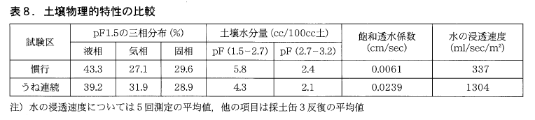 pF1.5での三相分布はうね連続栽培区の土壌が慣行区の土壌より液相率が低くなり,気相率が高くなりました。pF1.5-2.7の土壌水分量はうね連続栽培土壌が少なくなりました。