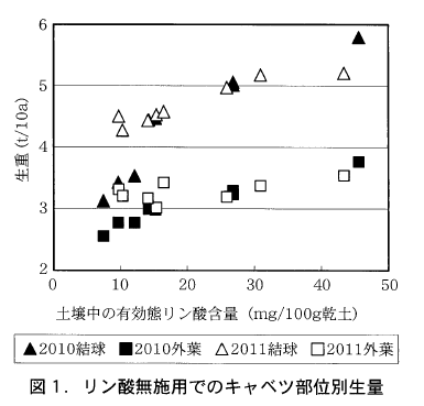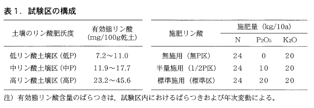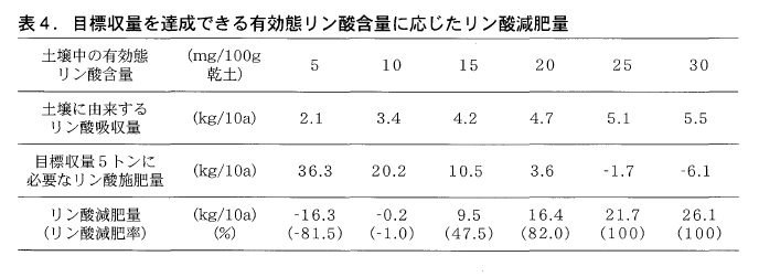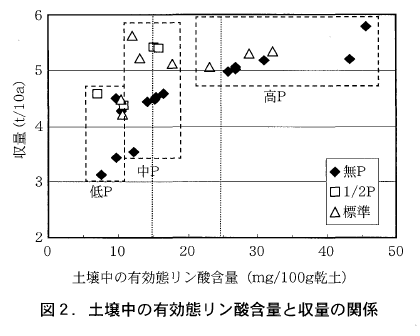 る。さらに,有効態リン酸含量が25mg/100g乾土かあるいはそれ以上である高リン酸土壌では,リン酸肥料を施用しなくても目標収量は十分達成できると考えられる。