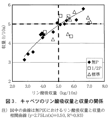 図3に示すように,キャベツの収量はリン酸吸収量とともに増加する傾向(正の相関)が認められた。ただし,試験区ごとにリン酸吸収量とキャベツの収量の相関をみると,標準区では正の相関が見られるものの低い相関関係であった。また,1/2P区では,明らかな相関関係が見られなかった。一方,無P区では,キャベツの収量とリン酸吸収量との間に,明らかに高い相関関係が確認された。このことから,無P区におけるリン酸吸収量,すなわち,土壌からキャベツに供給されるリン酸量は,キャベツの収量に大きく関係していると考えられた。さらに,無P区における収量とリン酸吸収量の関係式から,キャベツの目標収量5トン/10aを得るために必要なリン酸吸収量は5kg/10aと推定された。