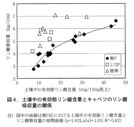 本報告の目的は,黒ボク土畑における夏まきキャベツ栽培において,土壌のリン酸肥沃度に応じたリン酸肥料の適正施肥量(減肥量)を求めることであり, このためには土壌中の有効態リン酸含量を把握する必要がある。有効態リン酸評価方法としては, ここで用いたトルオーグ法に加えて,ブレイNo.2法やオルセン法など様々な方法が提案されている。これらの方法のうち, どの方法が作物によって実際吸収されるリン酸量を測定できるのかについては,現在議論されているところであるが,本試験においては無P区における土壌中の有効態リン酸含量とリン酸吸収量には高い相関が認められる(図4)。このことから,黒ボク土壌における夏まきキャベツ栽培において, トルオーグ法で求める有効態リン酸含量は,適正施肥量を求める尺度として有効であると考えられる。また,トルオーグ法は,①測定が容易である,②測定に際して高額な機器を必要としない,③危険な廃液等が出ないなどの利点があることから,水田,畑など地目を問わず多くの土壌について適用されており,データベースが豊富である。そこで,本報告では,有効態リン酸含量の測定において一般的に用いられているトルオーグ法による有効態リン酸含量に基づいてリン酸質肥料の減肥量を求めた。
