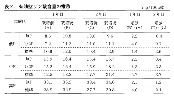 栽培前後における土壌中の有効態リン酸含量の差は, リン酸質肥料を2年間全く施用しなかった無P区においては,-0.4~2.5mg/100g乾土でほとんど変化せず,2年間の栽培期間では土壌のリン酸肥沃度はほとんど低下しないと考えられた。またリン酸質肥料を施用した1/2P区では0.1~4.0mg/100g乾土,標準区では1.4~5.7mg/100g乾土で, リン酸質肥料を施用することによりわずかながら有効態リン酸含量が増加する傾向が見られた。