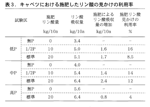 これらの結果から,リン酸肥料の肥効が認められる低P~中Pにおける施肥リン酸の見かけの利用率を計算すると,1/2P区ではリン酸施肥量10kg/10aに対して吸収量は1.4~1.6kg/10a増加するので,施肥リン酸の利用率は14~16%,標準区では8.5~12%と推定される(表3)。これは,野菜栽培における施肥リン酸の利用率が10%程度であるという既往の結果2)とよく一致している。本報告では,リン酸減肥量を求めるにあたって,施肥リン酸の利用率を過大評価することによって減肥可能量以上の減肥量が算出されることを防ぐため,最小値以下である8%をリン酸肥料の見かけの利用率とし,以下の推定に用いている。