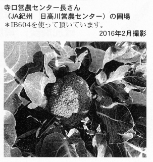 JA紀州は, 2014年4月に3つのJA(みなべいなみ 紀州中央 グリーン日高)が合併し発足しました。JA管内の御坊市は,色々な園芸作物が栽培されています。春はウスイエンドウ,夏はナスやゴーヤの栽培が盛んで,秋冬園芸ではブロッコリーを始めキャベツ・白菜が作られており,収穫物は主に京阪神に出荷されています。和歌山県のブロッコリーは近畿で1番作付面積(平成26年137ha)があり,中でも御坊市は特に栽培が盛んに行なわれている地域です。そこで,今回はブロッコリー栽培の模様とそれに使われているIB604についてご紹介いたします。