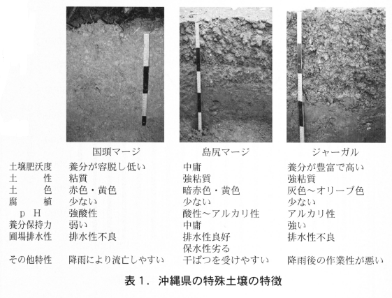 これらの土壌は,いずれも土色, pHや養分保持力などが特有の性質を示す。国頭マージはpHが低くて養分が溶脱した痩せた土壌,ジャーガルは石灰質であるためpHは高いが養分は比較的豊富な土壌,島尻マージは両者の中間的な性質を示すが,いずれも畑土壌としての生産性は低位である(表1)。