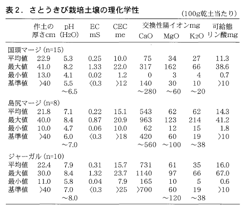 以上のように,さとうきび栽培土壌の地力は必ずしも良好であるとは言えない状況にあると推察される。すなわち,概してECや可給態リン酸ならびに交換性マグネシウムはほぼ適正であるが,作土は浅い, pHは変動が大きい,CECや交換性カルシウムは低いが交換性カリウムは高いなどと診断基準値から外れる項目が少なくないと思われる。