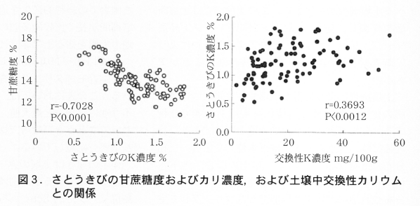 前述の結果から,さとうきびに対する生育・収量を確保し品質に影響する窒素,リン酸,カリの望ましい施肥法ついて考えてみると,土壌EC値と可給態リン酸はほぼ適正域にあるので,それぞれに対応する窒素およびリン酸に関しては施肥基準どおりに施肥することが増収につながると推察される。これに対して交換性カリウムは診断基準値を越えて過剰の状態である。さらに,図3に示すように,土壌の交換性カリウム含量が高い圃場のさとうきびほど作物体中カリウム含量が高いため甘庶糖度が低下するなどカリ過剰による品質低下が確認されている。高糖度が品質面で強く求められるさとうきび栽培では,カリウムが土壌中に過剰集積しないように定期的な監視を怠ってはならない。