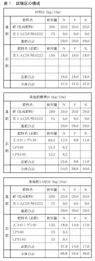 試験区の構成は表1のとおりである。基肥の施肥日は各区共通で3月10日である。追肥は条施肥区および1.5倍区は4月1日に施肥した。対照区の追肥は5月,7月,9月の3回に分けてCDU特S222を施肥した。※対照区追肥はN−P−K 25kg施用予定であったが,実績は表1のとおりとなった。