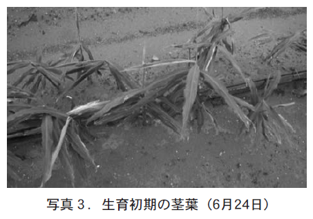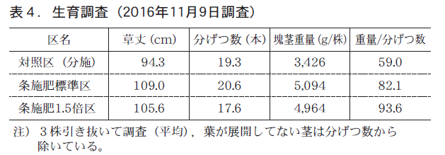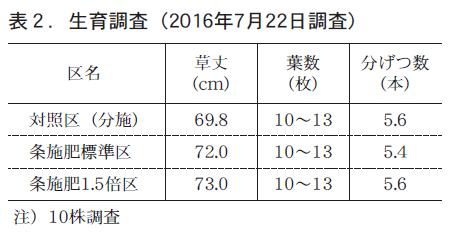 表2に示すように,定植から114日目に当たる7月22日の生育調査では,草丈は条施肥および条施肥1.5倍区がやや長くなったが,葉数および分げつ数は対照区とほとんど同じであった。