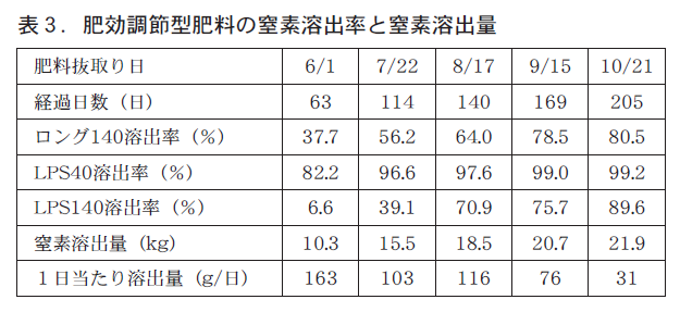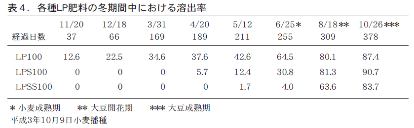 本栽培体系は,普及的にみて少ないが,被覆肥料の冬期間の溶出特性を把握できた点が評価できる。LP100は冬期間中でも溶出が進行するものの,LPS100や,LPSS100は冬期間(11〜3月)全く溶出しなかった(表4) 。当然,冬季の気象条件は,温度条件や積雪の有無等が違い一概にはいえないが,東北寒冷積雪地域での結果である。