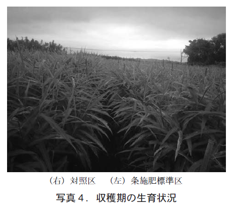 収穫日における生育では,表4に示したとおり,草丈は対照区に比べて条施肥区が高く,条施肥によって生育が旺盛になると考えられた。