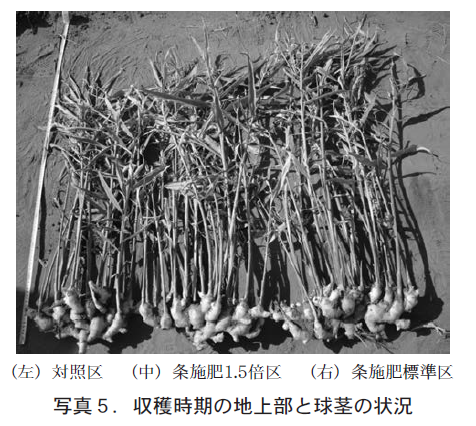 このように,追肥を条施肥にすることによって,しょうがの収量は増加し,品質も優れる傾向が認められた。但し,当初の計画通りに対照区の追肥が行なわれなかったため,条施肥の追肥量が対照区より多い条件下での比較となっている。