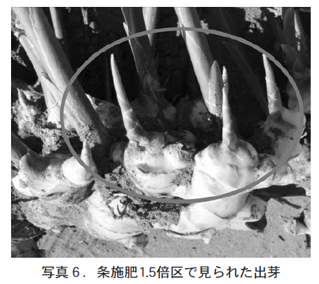 分げつ数にはあまり差はなかったが,条施肥1.5倍区で写真6のような新たな出芽の発生が多くみられ,しょうがの品質が劣るという評価となった。また初期に分げつした茎が地際でとろけているような株もみられたが品質等には問題はなかった。収量に相当する茎重量はバラツキがあるものの,条施肥区で重く,しょうが自体の充実(張り)も良かった。