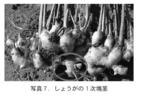 青木(1988)は,植え付けられた種しょうがからは1〜2本の幼芽が萌芽し,新芽が3〜5cmに伸長すると細根が発生する。新芽が5葉期になると新芽の株元から新しい新芽が分げつするとともに根部の発達が盛んとなる。次々と新しい分げつが行なわれ,塊茎の肥大・生長や根群の発達も盛んになると述べている。