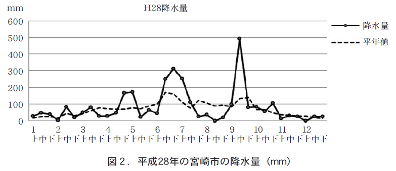 実証試験の試験場所は宮崎市佐土原町である。栽培試験はしょうが(大生姜)を用い,定植は4月1日,収穫は11月9日に行った。栽植密度は幅130cm,株間30cm,2条植え。試験区面積は1.3m×30m=39m2(反復なし)で行った。堆肥は2016年2月15日に共通施用した。また土壌消毒は2月15日にテロンで,3月10日にバスアミドで行った。