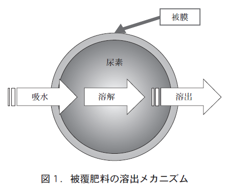 被覆尿素の場合は,図1に示すように,吸水,溶解した尿素が浸透圧によって被膜を通して溶出が始まる。溶出のコントロールは被膜の厚さや,溶出調整材を加えることによって,より正確な溶出調節を実現している。なお,溶出パターンは,初期の溶出割合の高い放物線タイプ,初期から直線的に溶出するリニアタイプ,初期の溶出が抑制されるシグモイドタイプ(内部の尿素が吸水,溶解,膨潤して被膜の孔隙を広げるまでは溶出しない)がある。