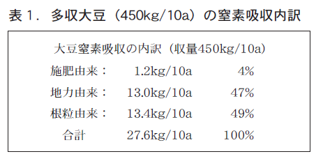 表1に多収大豆(収量450kg/10a)の窒素吸収内訳を示した。基肥窒素は,大豆化成(5−15−20)で2.5kg/10a,堆肥1t/10aを共通施用した結果であるが,窒素吸収総量27.6kgのうち,施肥窒素由来(15N使用)は,1.2kg/10aで総量の4%程度であるのに対して,地力由来が13kg/10a,47%,根粒由来が13.4kg/10a,49%で,地力および根粒由来窒素への依存度が際立っている。ここでは,地力由来を同時期に栽培したデントコーンのデータで代替えし,根粒由来は差し引き法で推定した。つまり,大豆多収にとって,重要なポイントは,開花期から幼夾期以降,旺盛な窒素吸収が重要であり,窒素地力と根粒活性が同程度に重要視されることを意味している。