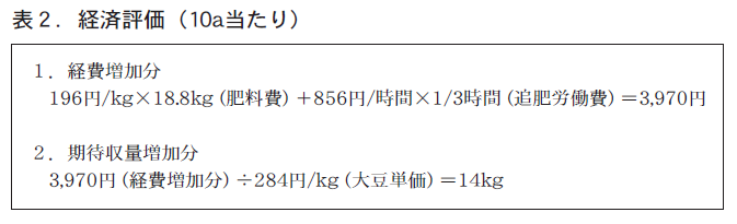 普及技術とした培土期追肥は,通常,培土する時期に,動噴等を利用し,LPコート70を7.5kg/10a施肥し培土するものであるが,試験では,培土期の肥料として,硫安とLPコート70を比較検討した。その結果,硫安施用では,根粒に悪影響を及ぼし根粒由来窒素が減少したのに対して,LP70は全く根粒に影響せず,地力由来窒素を押し上げる効果が認められ,結果として,幼夾期以降の窒素吸収量を増大させ,培土期に追肥しない慣行区に対して乾物重,有効節数が多くなるとともに,着夾数,一夾内粒数が増加し,慣行区対比111%の増収となった。なお,本技術を経済評価したところ,14kg以上の増収で,収益が増加することを明らかにした(表2) 。