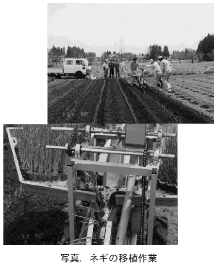 これまで,ネギの栽培は,育苗苗を一本ずつ人力で移植(10aの裁植本数4〜5万本)する方法が長く続いた。ところが,連結ペーパーチェーンポットが実用化され,それを「ひっぱりくん(チェーンポット簡易移植機) 」で定植できるようになり,規模拡大を可能にしてきた。ここでは,さらに省力化し,溝切り,移植,施肥の同時作業(写真)を開発した。