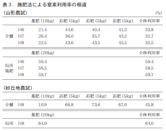 具体的データは,表3にあるように,重窒素を用いた3ヵ年(平成6〜8年)の試験成績によれば,山形農試圃場のような粘質畑土壌の場合,全層施肥による施肥窒素の利用率は基肥で23%程度,追肥(施肥後培土)で43%,全体で約34%なのに対して,被覆肥料を用いた全量局所施肥による利用率は59%で,25%程度の利用率向上が認められた。なお,同様に砂丘地では,慣行栽培である全層施肥における施肥窒素利用率は,わずか10.9%であるのに対して,被覆肥料による局所施肥の利用率は64%と極めて高く,環境への負荷の少ない効率的施肥技術であることを確認した。