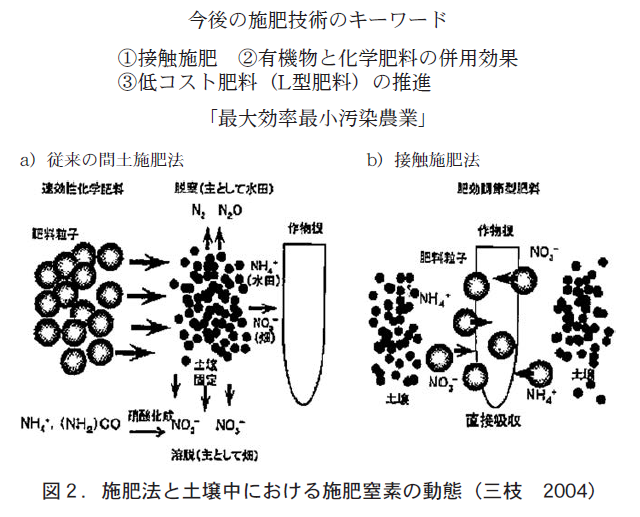 化学肥料の効率的施肥技術については,適切な肥料形態を選択し,施肥位置を考えるとともに,植物の要求にマッチした肥料成分を供給することにある。これまで,速効性の化成肥料では,土壌による希釈を前提として全層施肥を行ってきたが,被覆肥料の出現で,肥料を種子や根の付近に直接施肥することを可能にした。とくに,シグモイド型の溶出特性をもつ被覆肥料は,水稲の育苗箱施用や野菜ポット施肥を実用化した。