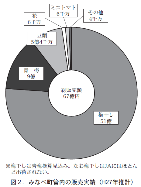 また同町は内外で有名な「南高梅」の発祥の地で,平成27年には種苗名称登録50周年を迎えています。平成18年には,地域団体商標【紀州みなべの南高梅】を取得し,全国の3割のシェアに相当する約35,000トンの生産量があります。管内農家の約1,400戸ほぼすべての人が梅を栽培し,町の人口の45%が農家で,農業収入の大部分を梅が占めています。みなべ町管内の平成27年度の販売実績(図2)をみると,総販売額が67億円であるのに対して,梅干しは51億円,青梅は9億円に達し,両者を合わせた梅産業の占める割合は90%と非常に高く,梅が地域の基幹作目であることは明らかです。