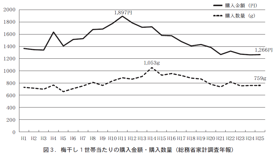 しかし近年は,図3に示すとおり,梅干し1世帯当たりの購入金額はピーク時の平成11年に1,897円であったのが,平成25年には1,266円と33%減少,1世帯当たりの購入数量は平成14年に1,053gであったのが平成25年には759gと28%減少する傾向にあり,梅の消費や高級品の低迷等,需要と供給のバランスが崩れ,梅農家の経営は年々厳しくなっています。