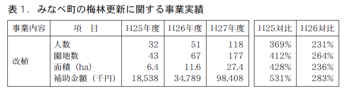 そのために経営基盤である梅生産の安定化を図る目的で梅園の更新に着手しました。具体的には老木園や収量の低い梅園を改植することにしました。改植に係る費用は,たとえば果樹経営支援対策事業など国の補助金制度を積極的に活用しました。表1に示すとおり,平成27年現在取り組む農家数は118人,園地数は177圃場,ならびに対象面積は27.4haで,平成25年に比べてそれぞれ3.7倍,4.1倍および4.3倍に増加しています。また,これに伴って補助金も平成27年度は98百万円と2年前の5.3倍の増額となっています。この結果は,梅の生産基盤の安定化のための改植に各農家とも積極的に取り組んでいることを意味しています。