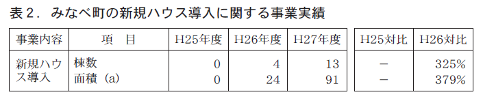 複合経営の品目は,ウスイエンドウやキヌサヤエンドウなどの豆類,ミニトマト,小玉スイカ,キャベツ,なのはななどです。これらの品目は海岸線と山間部に地帯区分されます。海岸線では,豆類とミニトマト,小玉スイカやキャベツなどの野菜栽培を複合経営の相方品目として推進しました。これらのうち施設栽培に適した品目については,県の野菜花き産地総合支援事業などの補助金制度を有効に活用してビニールハウスを設置し,平成27年度にはハウス13棟で設置面積91aに達しています(表2) 。