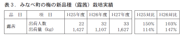 一方,山間地においては,比較的冷涼な気候に適したなのはなの栽培を進めるとともに,梅の新品種‘露茜’の栽培を推進しました。‘露茜’は農研機構果樹研究所が育成した品種です。生食用ではありませんが,梅酒や梅ジュースなどの梅加工品に適した品種であり,平成27年度で出荷人数33人,出荷量1,627kgと前年に比べて需要が拡大しています(表3) 。
