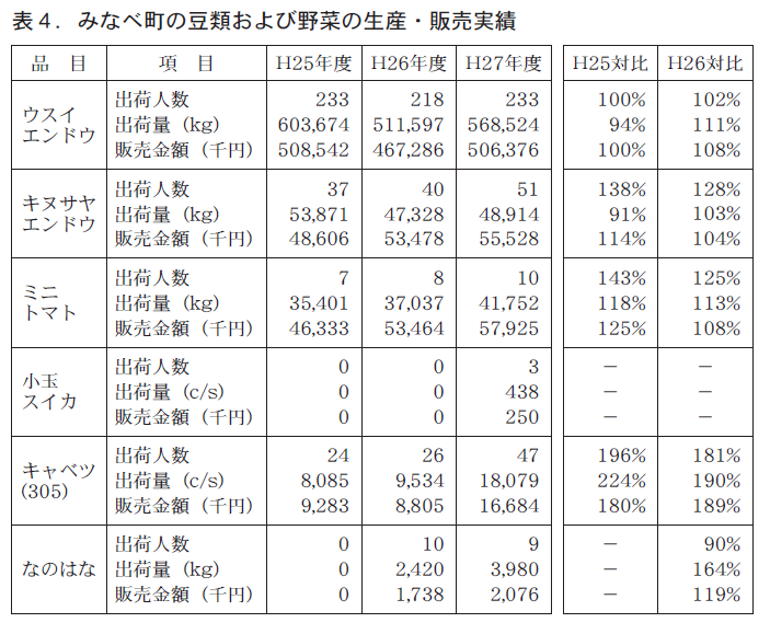 みなべ地区の山間部は,他地区と同様に,平地が少なく,気温も低く,日射量も少ないことから,野菜栽培には不適な地域とされています。このため,寒さに強く軽量で高齢者でも比較的作業がしやすいなどの理由から,なのはなの栽培を推進しました。平成27年度現在9人の方が従事しています(表4) 。