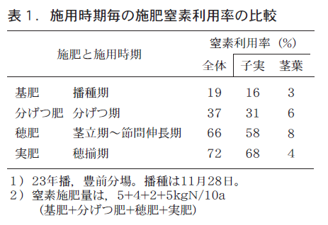ラー麦に対しては実需者から12%以上のタンパク質含有率が求められている。標準窒素施肥量は10a当たり基肥5kgN,分げつ肥4kgN,穂肥2kgN,穂揃期追肥5kgNである。各施肥における窒素利用率のうち,穂揃期追肥が約70%と非常に高く,窒素施肥量の多さからタンパク質含有率に対する寄与が非常に大きい(表1) 。