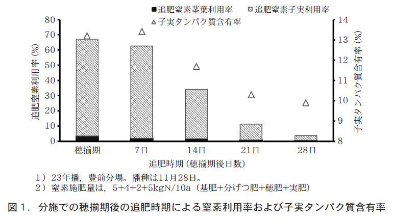 この穂揃期に施用する実肥は,出穂から約2週間以降に施用すると,麦体による吸収は進行せず,施用が遅れるほどタンパク質含有率は低下する(図1) 。