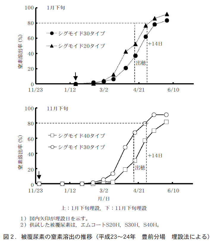 上記の分施体系での登熟期間中の麦体の窒素吸収・転流特性を考慮して,1月下旬の分げつ肥時の施用を想定して,子実タンパク質含有率に対して最も効果的な出穂前後の肥効発現が大きい被覆尿素としてシグモイド20タイプを選定した。表記されている25℃の条件での窒素の80%溶出日数と,低温期を挟む麦作期間中では施用から80%溶出までの実際の溶出日数とでは,ズレがある。(図2上) 。また,低温期の緩やかな窒素肥効を確保するため,溶出温度依存性が被覆尿素とは異なるイソブチルアルデヒド縮合尿素を併用することが有効である(データ略) 。