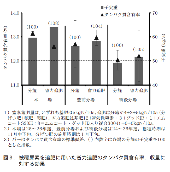 硫安に加えて,緩効性肥料としてシグモイド20タイプ被覆尿素(エムコートS20H)とイソブチルアルデヒド縮合尿素(グッドIB)を配合した肥料を1月下旬に施用すると標準施肥と比較して,収量は同水準でタンパク質含有率も目標値である12%を達成し,かつ,穂揃期の実肥に加え,節間伸長期に施用する穂肥の省略と追肥回数を1回に削減できる(図3,図4) 。