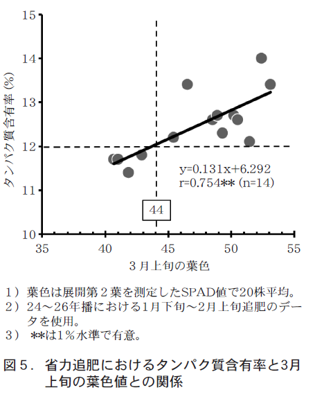 ラー麦の3回分の追肥を1回でカバーする肥料は,エムコート・グッドIB入り複合3004(30−0−4)として販売されている。当肥料を用いた省力施肥法では,従来の標準施肥法と比べ肥料代は30%近く割高となるが,施肥作業回数が削減できるメリットは大きい。また,緩効性肥料を利用するに当たって,懸念されるのは環境要因による窒素溶出の不安定さである。温度については,気温(地温)の低い冬季においては年次変動の影響は小さい。それよりも,降雨による圃場コンディション悪化により,施用時期が2月上旬まで遅延したり,北部九州では基本技術となっている土入れ作業の未実施等,作業上の制約による溶出の不安定化は生産性への影響が大きい。そこで,地力の圃場間差への対応も含めて,品質の徹底を図るため当施肥法と3月上旬の葉色診断を組み合わせることとした。葉緑素計の値で44を下回った場合には,穂揃期に実肥2kgNをダメ押しで施用することで,子実タンパク質含有率12%を維持できる(図5,一部データ略) 。