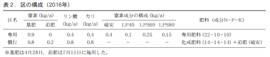 2015年度の結果を踏まえ委託元と協議し,試作専用肥料の構成成分を変更した。すなわち,総窒素量を0.9kg/aとし,硫安を0.1kg/a増やして0.4kg/a,LP40を0.1kg/a,LPS60を0.25kg/a,LPS80を0.15kg/aに調整した(肥料成分:窒素22%,リン酸10%,カリ10%) 。この試作専用肥料を用いて,慣行施肥体系(基肥0.8kg/a:化成肥料,穂肥0.2kg/a:硫安)と生育・収量・品質を比較した。詳細は表2のとおりである。移植については,地域慣行の5月13日に稚苗を機械移植で行った(株間16cm,70株/坪) 。
