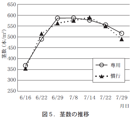 茎数は、6月下旬から専用肥料区が慣行区よりやや多く推移したが,7月中旬には同等になり,7月下旬には再び専用肥料区が多くなった(図5) 。