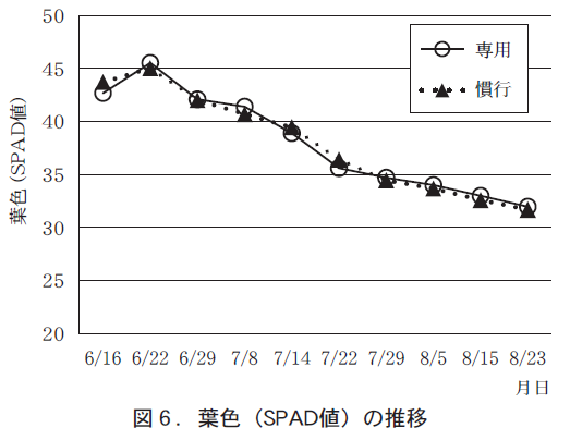 葉色(SPAD値)は,慣行区が,追肥(7月11日)後一時的に専用肥料区よりやや上回ったが,7月下旬以降はほぼ同等に推移した(図6) 。