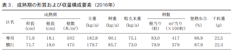 成熟期の生育は,稈長,穂長および穂数ともに専用肥料区と慣行区に大きな差は認められなかった(表3) 。