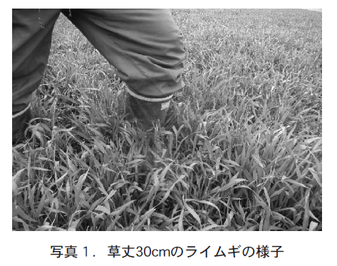 鋤込み後の肥効を活用する場合,長靴が埋まる位(写真1)がライムギの鋤込み適期である。