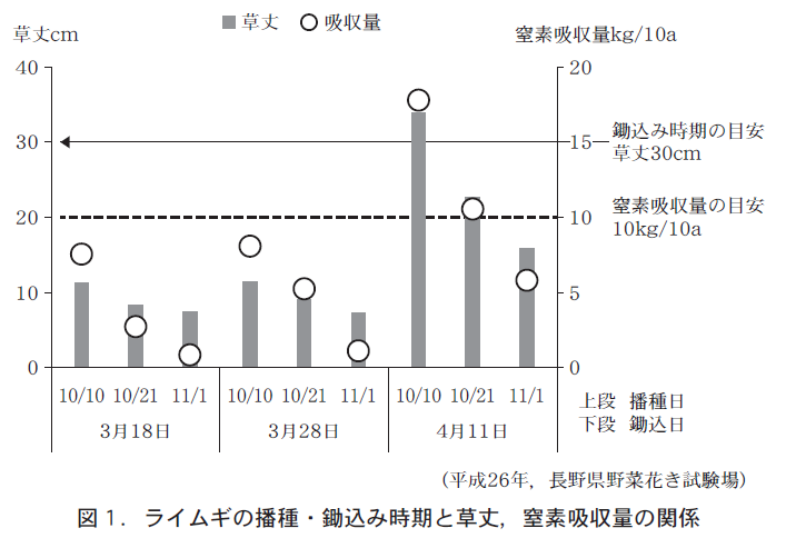 ライムギが10kg/10a以上の窒素吸収量を確保できたのは10月10日または10月21日に播種し4月11日に鋤込んだ場合であった(図1) 。窒素吸収量と草丈との関係を見ると,10月10日播種で4月11日鋤込みでは草丈34cmで窒素吸収量18kg/10a,10月21日播種で4月11日鋤込みでは草丈23cmで窒素吸収量11kg/10aであったことから,草丈30cm前後が窒素吸収量10kg/10a以上を確実に得るための目安となると考えられた。