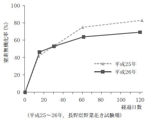 平成26年は大雪が降り供試したライムギの生育が遅れる悪条件であったが,平成25年,26年とも埋設1か月後には50%程度,2か月後には60〜70%程度と多くの窒素が無機化した(図2) 。