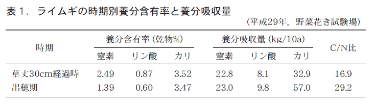出穂期のライムギの草丈は,鋤込み適期である草丈30cm経過時に比べ4倍近く高くなったが,乾物重は1.8倍に止まった。一方,出穂期のライムギの窒素含有率は草丈30cm経過時に比べ半分程度に低下していたため窒素吸収量は草丈30cm経過時も出穂期と同程度となった(表1) 。