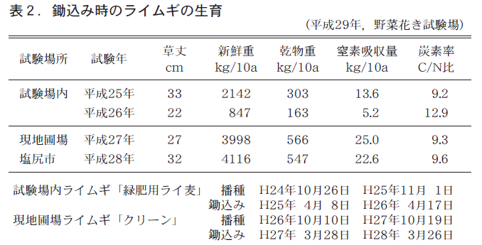 鋤込み時のライムギの窒素吸収量は試験場内圃場5〜14kg/10a,現地圃場23〜25kg/10aであり,炭素率は9〜13の範囲にあった(表2 平成26年は大雪が降り生育不良) 。一般に,家畜ふん堆肥の炭素率は10〜20前後で,その中でも窒素含量が高い鶏ふんや豚ぷん堆肥は炭素率が低い。本試験で供試した草丈30cm前後のライムギの炭素率は鶏ふん並みであった。