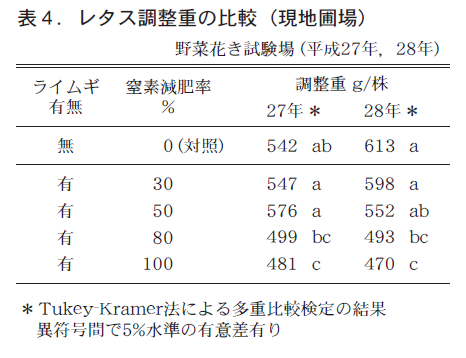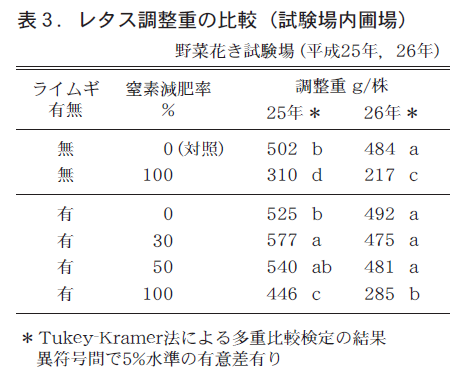 草丈30cm前後のライムギは出穂期と同等の窒素を吸収しており鋤込み後の分解性も良いことがわかった。さらに鋤込んだライムギの窒素肥効を活用し後作のレタス栽培で本当に窒素減肥できるかどうかを確認するため,試験場内圃場及び現地圃場でレタスの窒素減肥試験を行った。