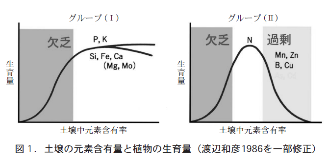 従来の教科書では土壌中の元素含有率と生育量には右図のグループ(II)のように土壌中の元素が不足し,生長が阻害される欠乏域と元素が過剰となり障害が起きる過剰域があるとされている。しかしながら,渡辺(1986)は長年のフィールド経験と詳細な観察から元素が不足すると生育が阻害されるが,過剰に存在しても大きな生育障害とならない元素(グループ(I))があることを明らかにした。この知見は効率的養分管理を行う上で極めて重要である。すなわちグループ(I)の元素は過剰障害が起こり難いので,作付け前の土壌診断で必要量を把握し,充分量を施しておけば生育期間中大きな問題は起こらないものが多い(鉄やカルシウムは体内を移動しがたいので生育期間を通じて常に供給が必要) 。これに対してグループ(II)の元素は欠乏と過剰が問題となるので土壌診断とともに,生育期間における作物栄養診断が重要となる。グループ(II)の多くは天然供給が期待できる微量要素が多く,多量要素では唯一窒素が問題となる。それ故,営農上,最も養分管理が重要な元素は窒素である。一般に,植物が吸収する窒素は土壌中で不足しており,植物の要求量も無機元素の中で最大で植物の生育を支えるタンパク質,核酸などの重要成分である。また葉身の窒素含量は,光合成量と正の相関があり,光合成窒素とも呼ばれる。その上,体内での適正幅が狭く,過剰となると植物体が脆弱で,倒伏や罹病し易く,また生殖成長阻害が起こるので窒素養分の管理は特に注意する必要である。窒素成分の過不足は葉色に顕著に現れるので,生育期間中の葉色のモニタリングが特に重要である。