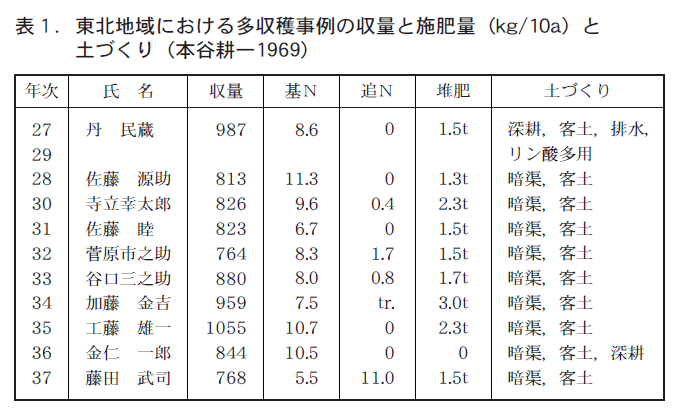 表1に見られるように東北地域の米作日本一栽培では深耕,客土,排水(暗渠) ,リン酸多用などの土づくりを励行するとともに,5.5〜11.3kg/10aと多量の基肥窒素の施用で初期生育を確保し,また1.3〜3トン/10aと多量の堆肥施用で後期凋落を防止し,10アール当たり800〜1000kgの多収を達成している(基肥窒素が5kgと相対的に少ない昭和37年の藤田武司氏は追肥窒素が11kgと多く,堆肥施用が行われなかった36年の金仁一郎氏は前年に多量の堆肥が施用されている) 。しかも,1トン前後の超多収をあげた丹民蔵,加藤金吉,工藤雄一氏の窒素1kg当たりの玄米生産効率は60〜80kgと当時の西南暖地や北陸の湿田,現在の化学肥料中心の稲作の50kg以下に比べて極めて高い。窒素の玄米生産効率と白米のタンパク質含量には負の相関があり,白米のタンパク質含量と食味評価値には負の相関関係があることから,窒素の玄米生産効率が高い米は食味値が良好と言える。このことは米の多収栽培と良食味栽培の両立は可能であり,その技術としては化学肥料による初期生育の確保と堆肥による緩やかな後期窒素の供給が重要と言える。有機性廃棄物が氾濫する現在ではその循環利用が叫ばれており,現在でも堆肥や稲わらの大量還元は可能である。米の多収栽培と良食味栽培の両立は,従来の速効性窒素(前期窒素栄養確保)と肥効が制御できる肥効調節型被覆肥料(後期窒素栄養)の組み合わせでも可能と言える。