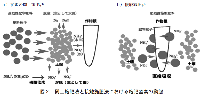 肥効調節型被覆肥料を用いた接触施肥法と従来の速効性肥料による間土施肥法における施肥窒素の動態を図2に示した。従来の速効性肥料では肥料成分の溶解が容易に起こり作物に接触して施用すると,肥料焼けやアンモニア過剰害を引き起こす。そのため肥料と作物根(種子)の間に数cmの間土が必要であった。1gの土壌中には土壌微生物が数億個,数千種類が存在するといわれ,酸化的畑土壌では,アンモニア態,尿素態で施用しても容易に硝酸態窒素になり,アニオン交換能を殆ど持たない通常の土壌中では,降雨で容易に流亡する。また,水田土壌では土壌表面の酸化層とその下部の還元層との境界で脱窒現象が起こり,水稲への硝酸態窒素の供給は困難であった。